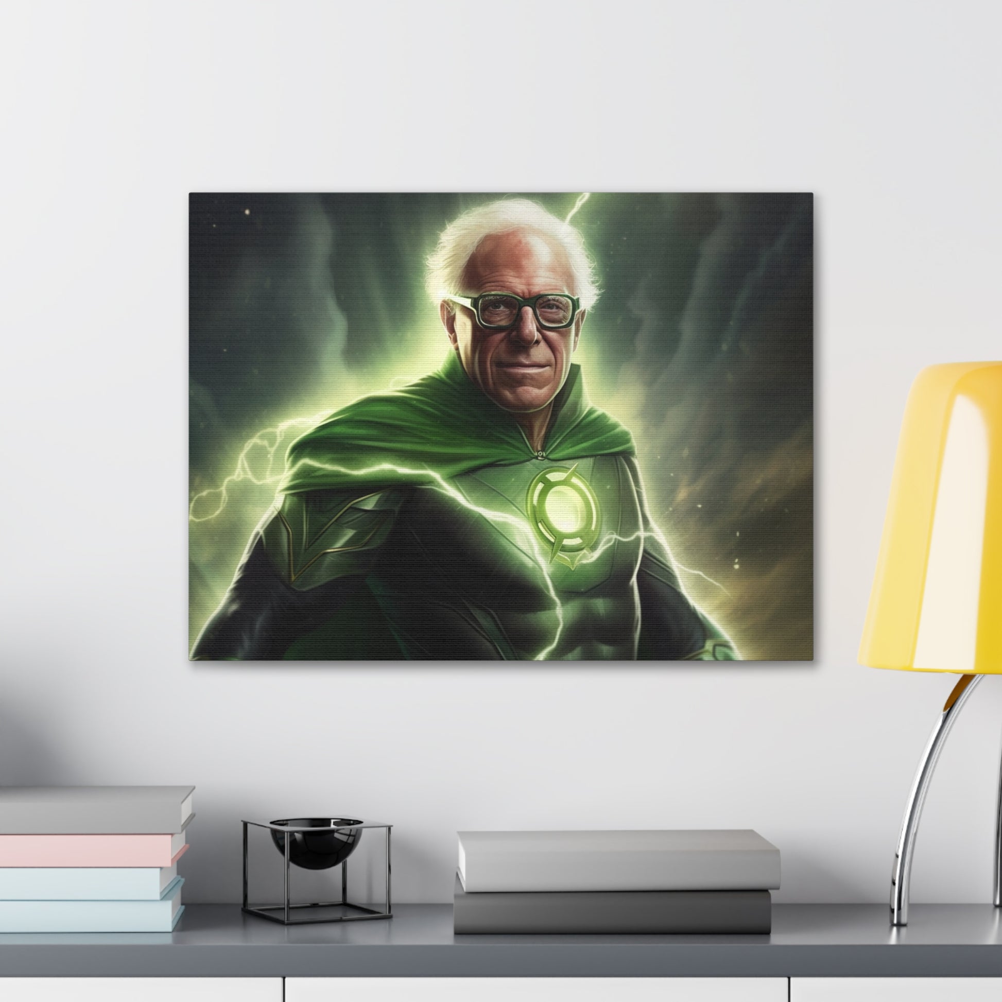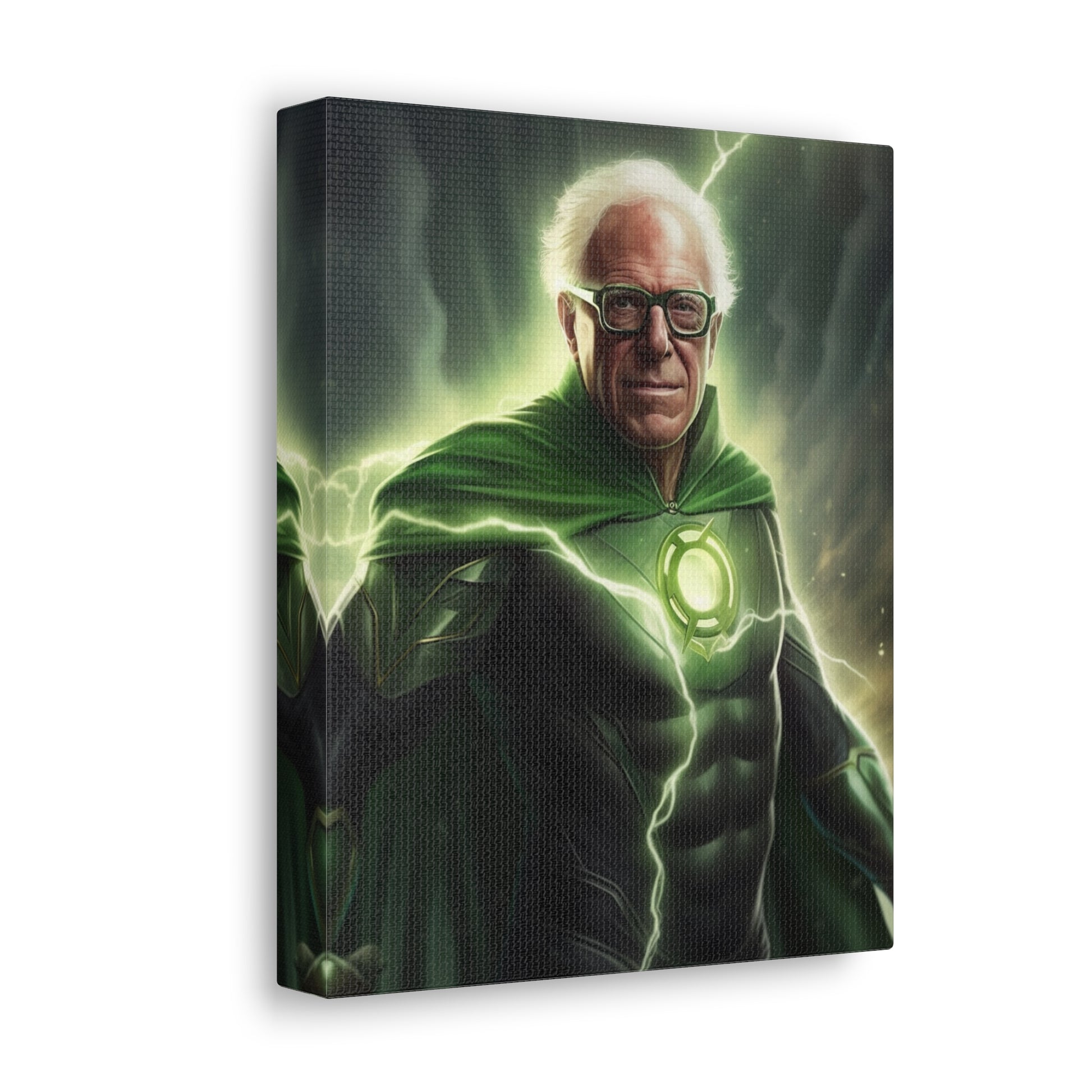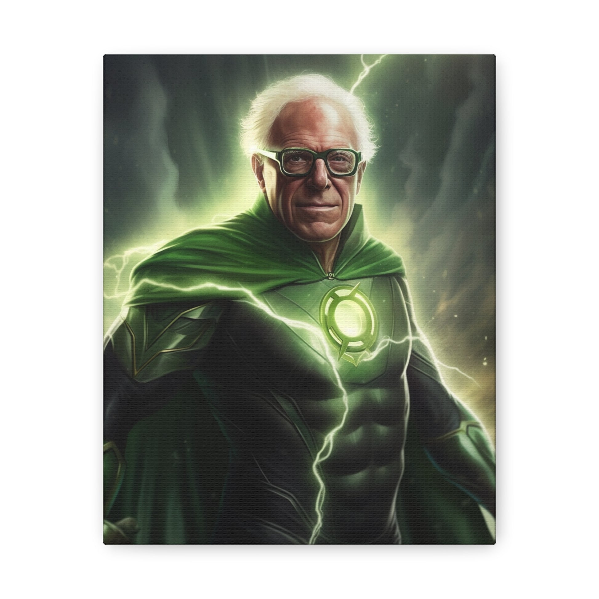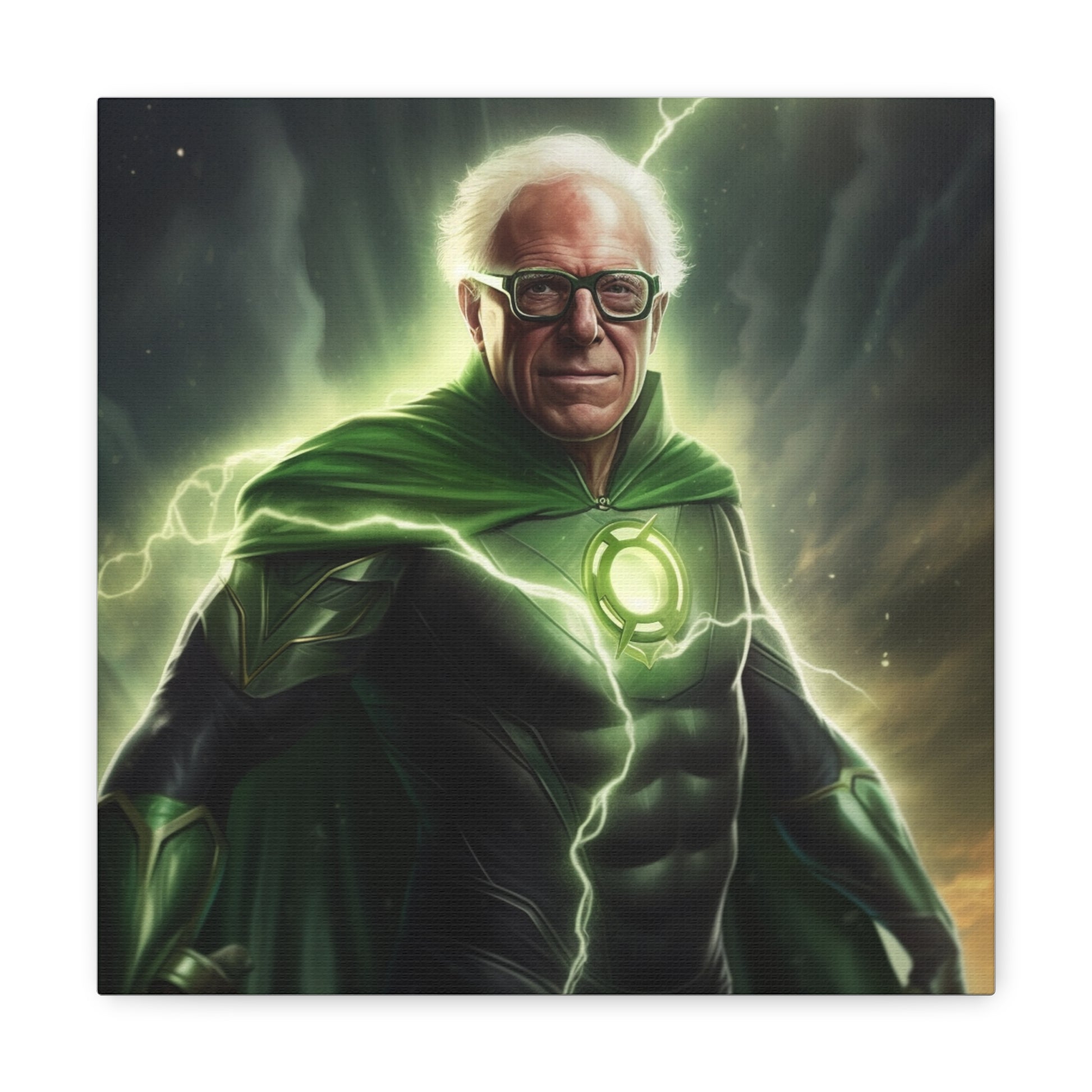 Illuminate your space with our groundbreaking AI-crafted canvas artwork, "Emerald Resolve: The Beacon of Burlington." This inspiring piece marries the unwavering willpower of Bernie Sanders with the determination and interstellar authority of DC Comics' Green Lantern.