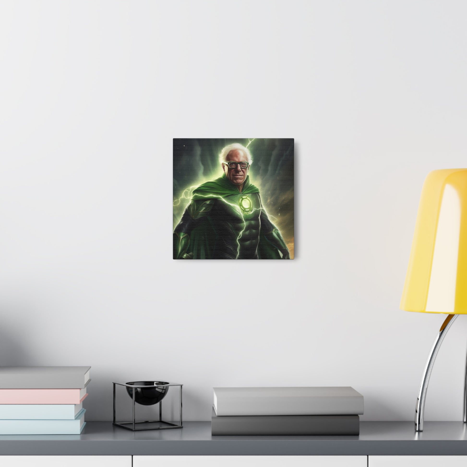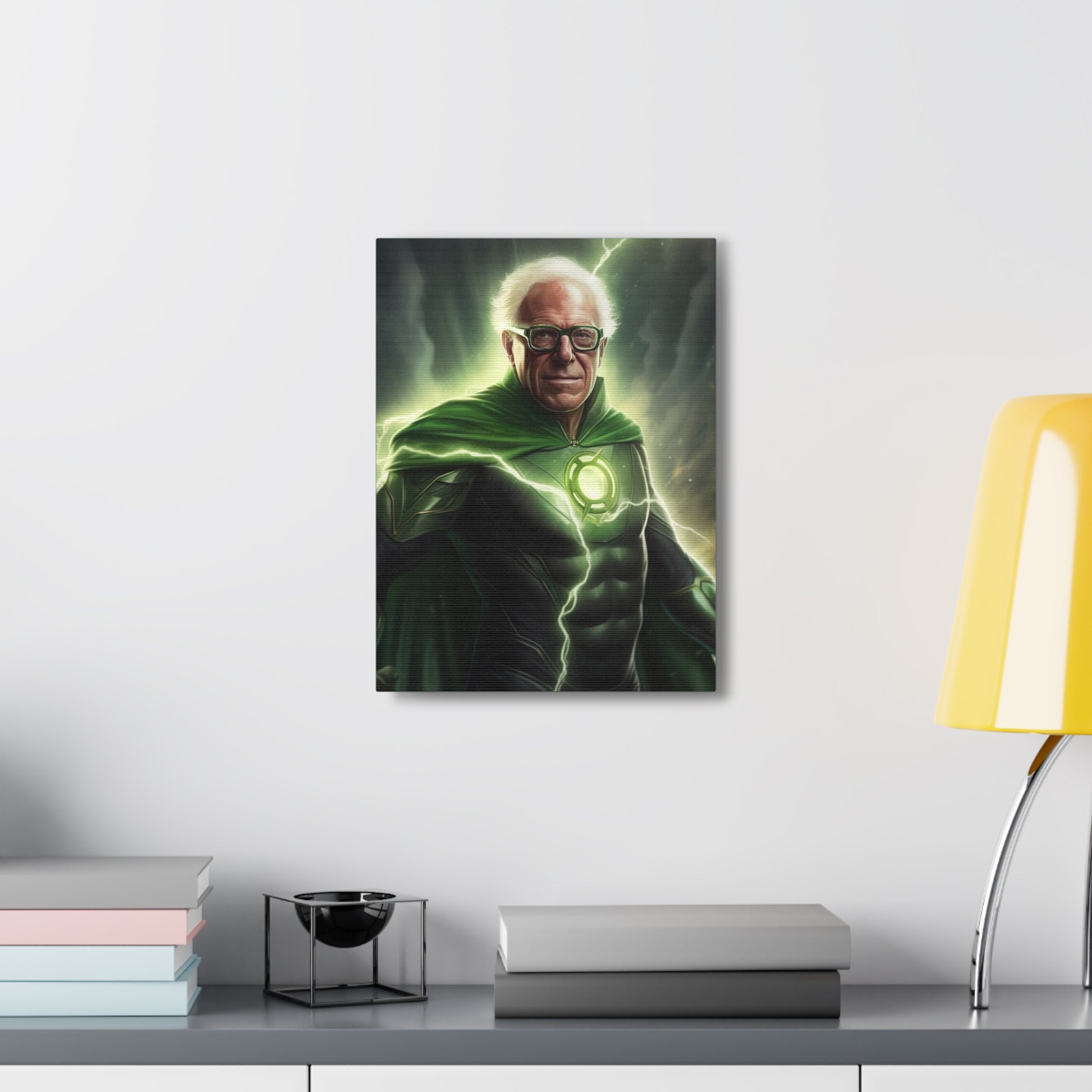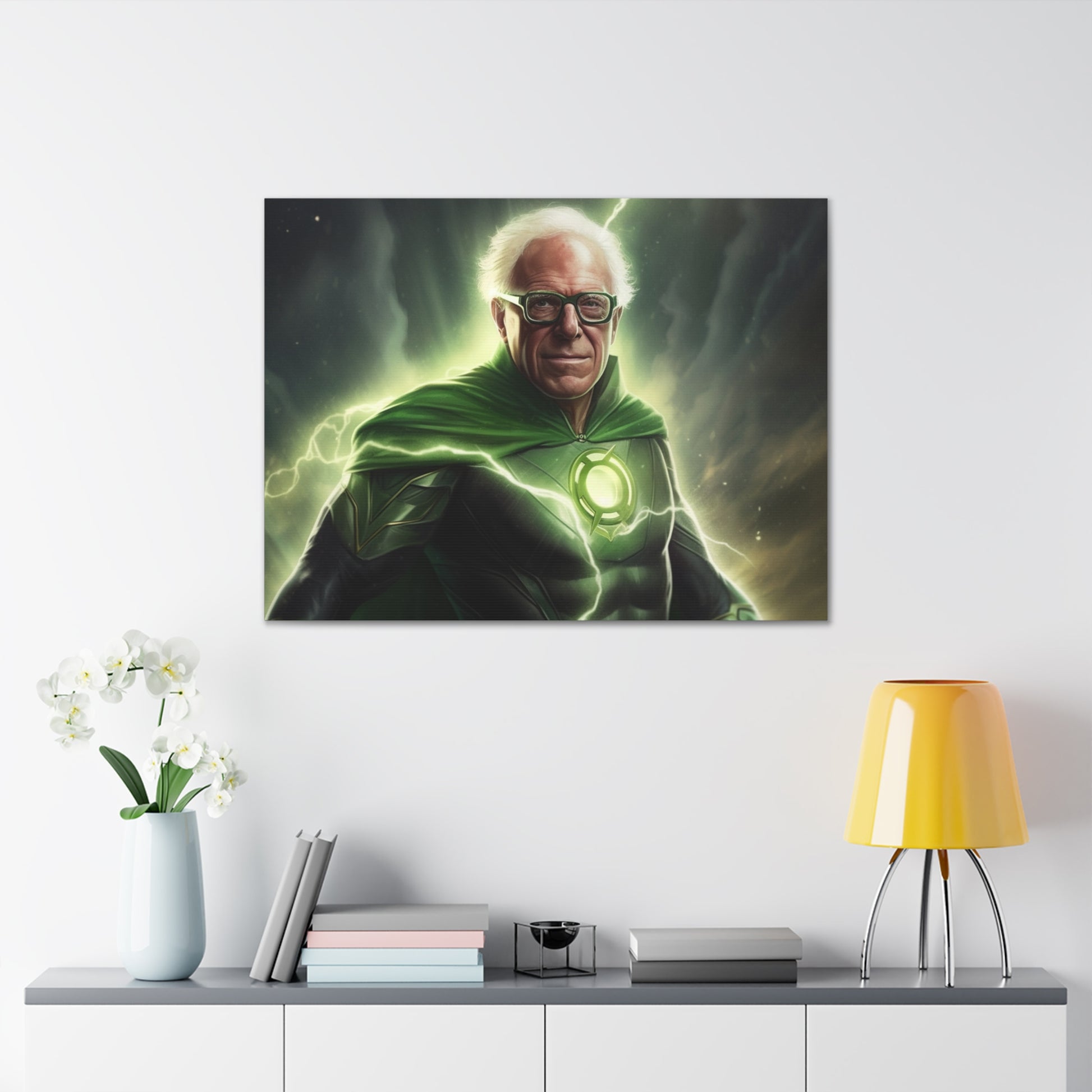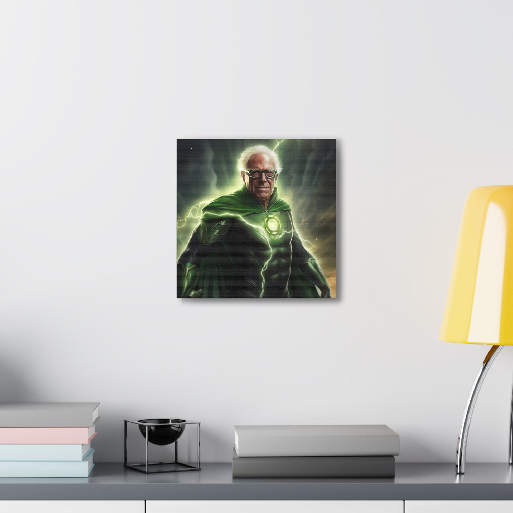 Illuminate your space with our groundbreaking AI-crafted canvas artwork, "Emerald Resolve: The Beacon of Burlington." This inspiring piece marries the unwavering willpower of Bernie Sanders with the determination and interstellar authority of DC Comics' Green Lantern.