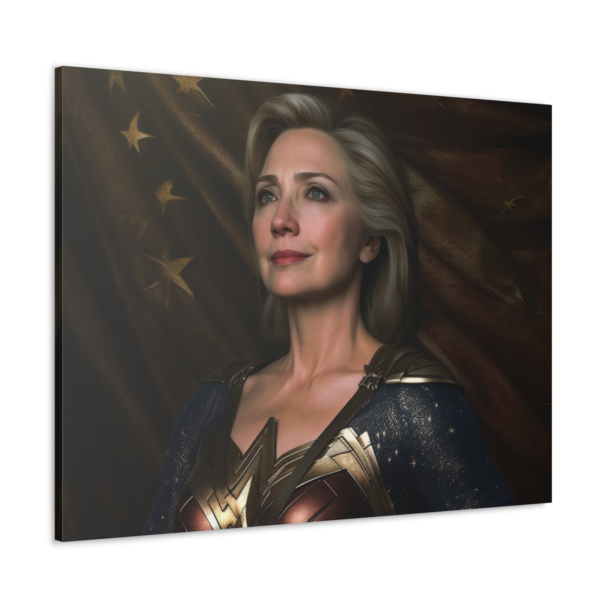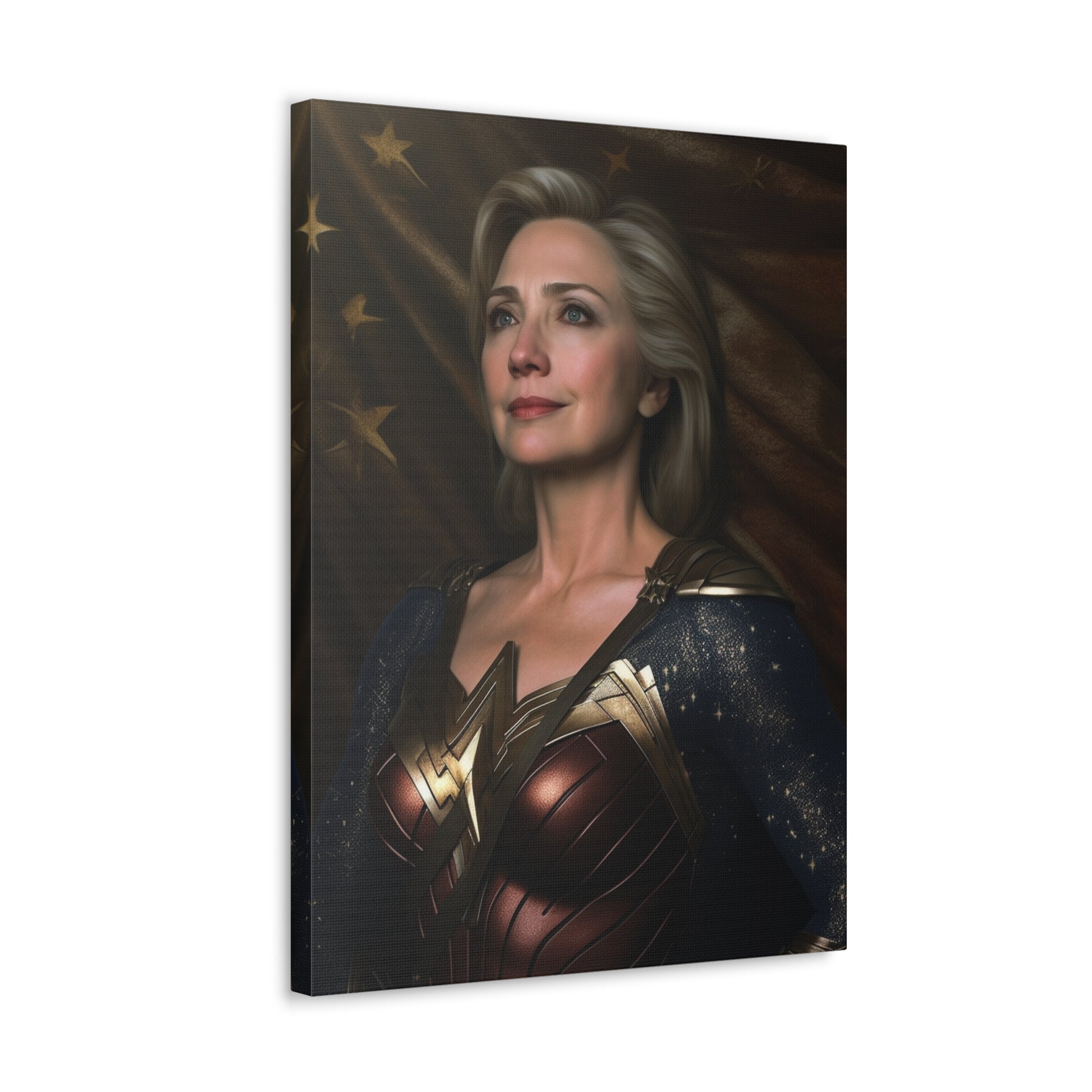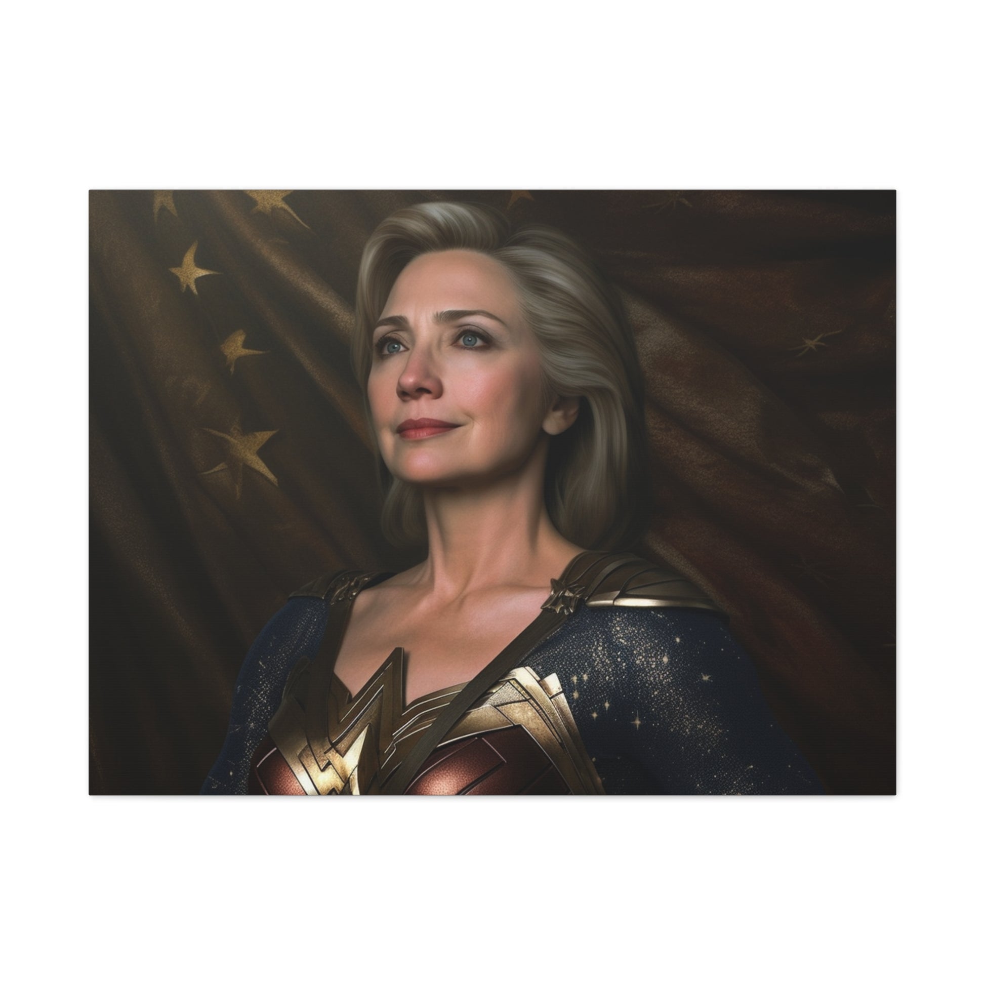 Get ready to lasso in admiration and curiosity with our latest AI-generated canvas artwork, "Lasso of Truth: The Amazonian Diplomat." This intriguing piece portrays a unique fusion of strength and grace by pairing the political force that is Hillary Clinton with the indomitable spirit of Wonder Woman.