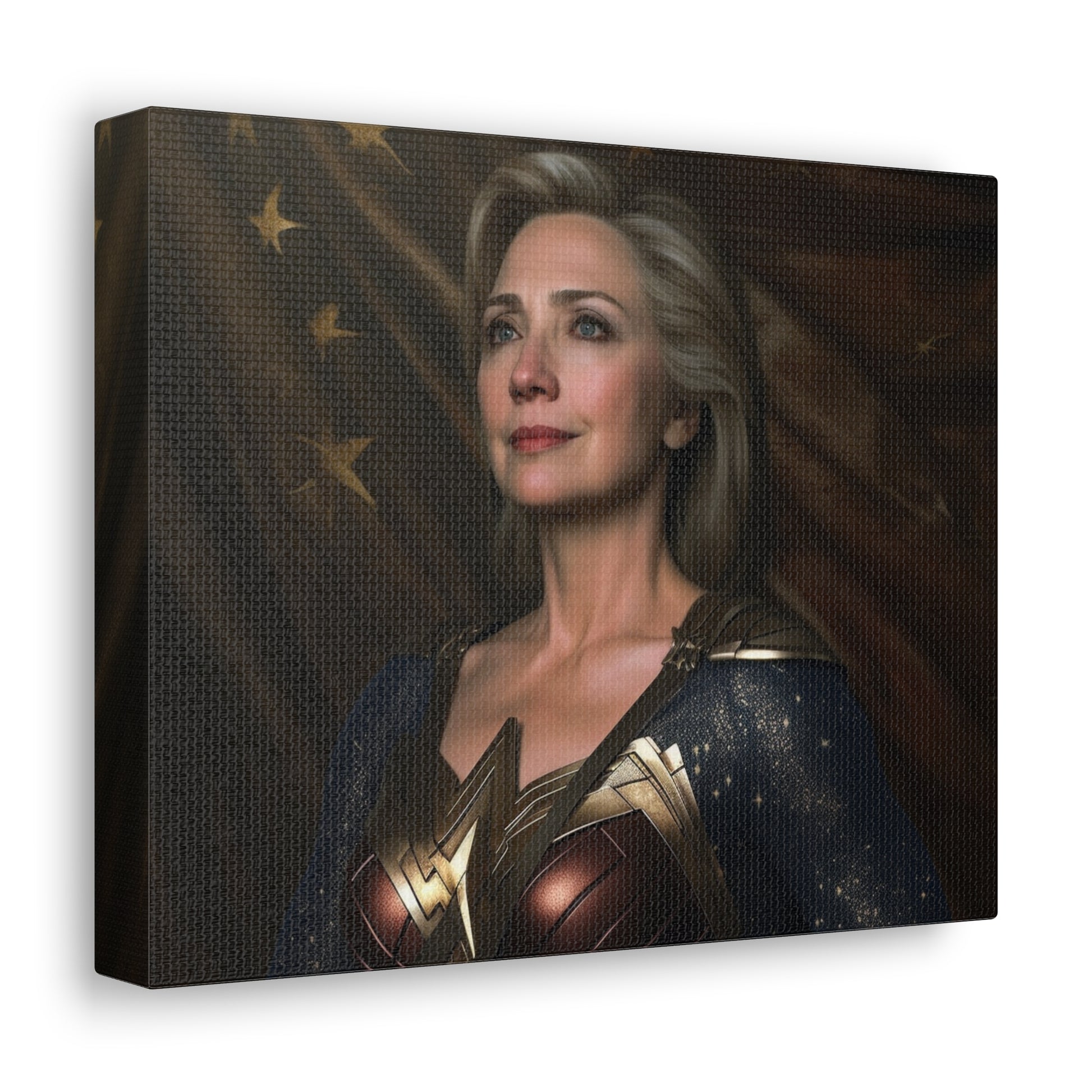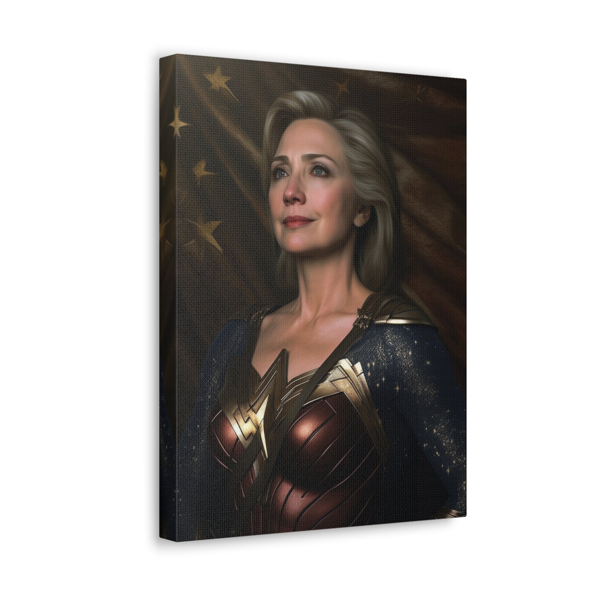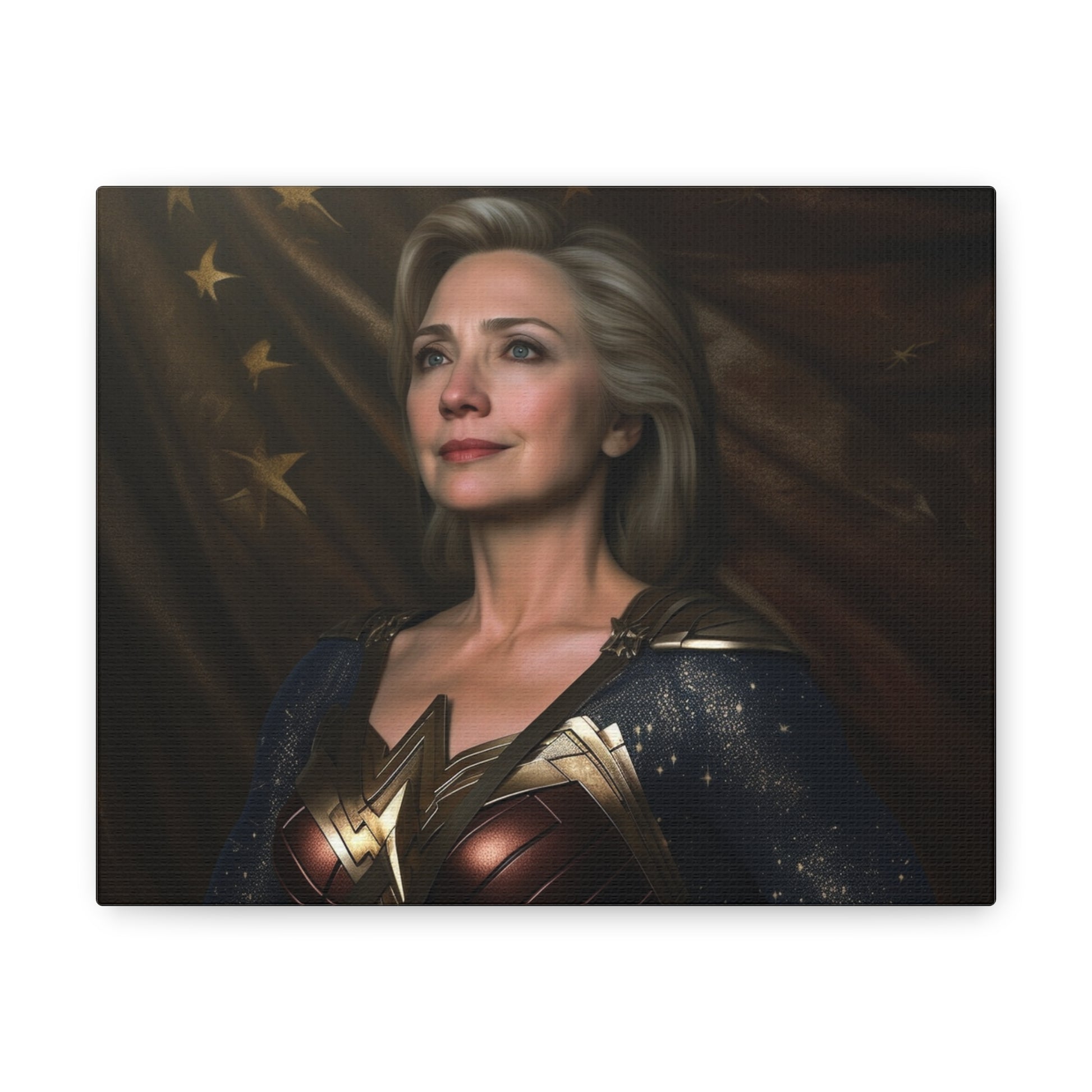 Get ready to lasso in admiration and curiosity with our latest AI-generated canvas artwork, "Lasso of Truth: The Amazonian Diplomat." This intriguing piece portrays a unique fusion of strength and grace by pairing the political force that is Hillary Clinton with the indomitable spirit of Wonder Woman.