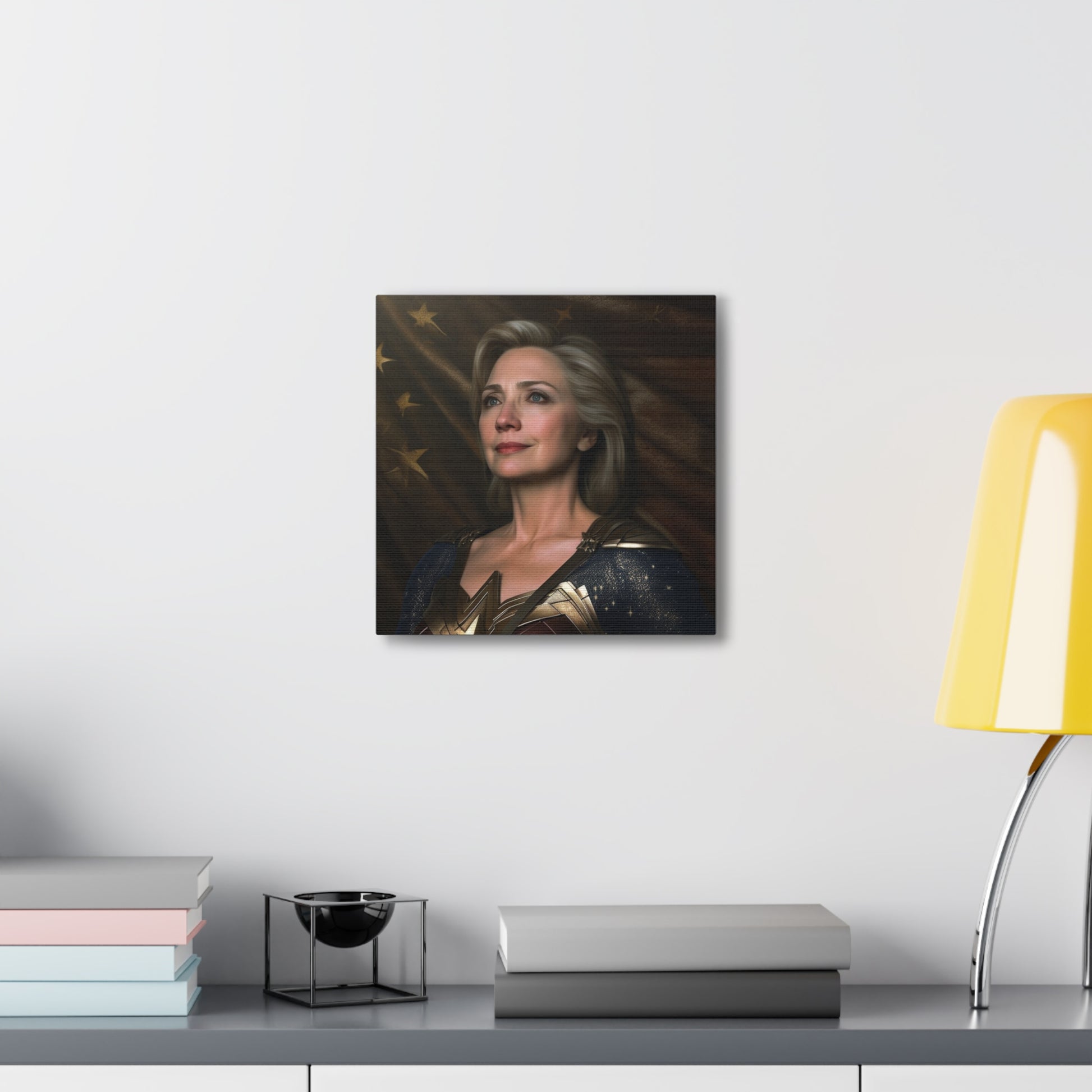 "Lasso of Truth" captures Clinton's steadfastness and resilience, wrapping it in the golden armor of Themyscira's greatest warrior. The painting explores the parallel lives of two powerful women in their respective universes, both symbols of inspiration and perseverance. With this dynamic and thought-provoking artwork on your wall, you invite conversation about power, diplomacy, and the challenges faced by women in leadership. Experience the wonder of "Lasso of Truth: The Amazonian Diplomat."